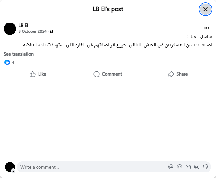 مراسل المنار :اصابة عدد من العسكريين في الجيش اللبناني بجروح اثر اصابتهم في الغارة التي استهدفت بلدة البياضة