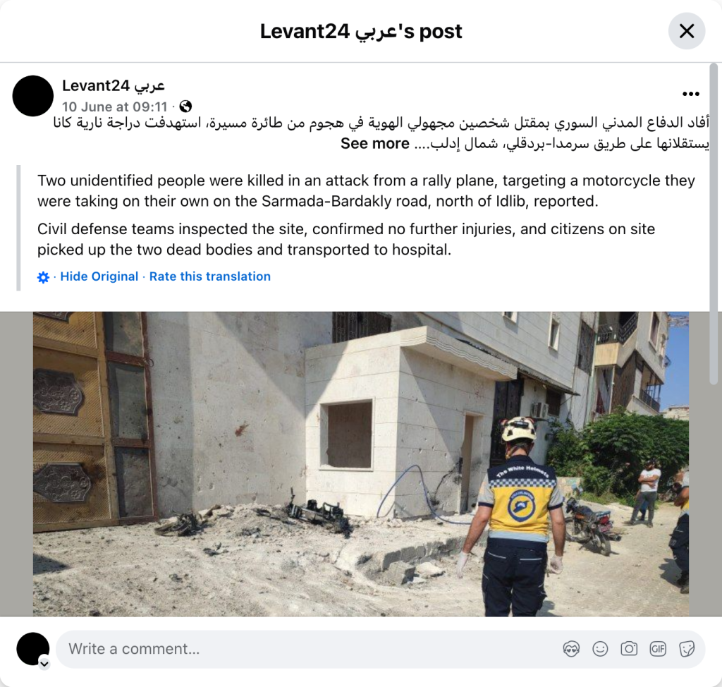 Two unidentified people were killed in an attack from a rally plane, targeting a motorcycle they were taking on their own on the Sarmada-Bardakly road, north of Idlib, reported. Civil defense teams inspected the site, confirmed no further injuries, and citizens on site picked up the two dead bodies and transported them to hospital. · Hide Original · Rate this translation