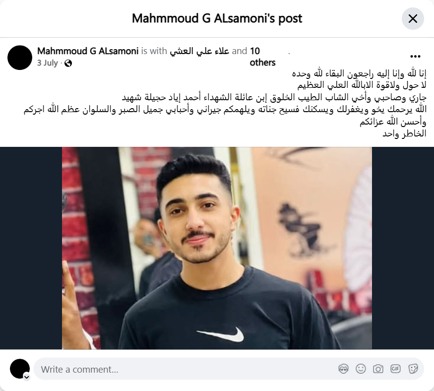 To Allah we belong and to Him we shall return. To Allah we belong and to Him we shall return. Only Allah is eternal. There is no power or strength except with Allah, the Most High, the Almighty. My neighbor, friend, and brother, the kind and well-mannered young man, son of the martyred family, Ahmad Iyad Hajila, is a martyr. May Allah have mercy on you, brother, forgive you, and grant you a place in His spacious gardens. May He inspire you, my neighbors and loved ones, with patience and solace. May Allah reward you greatly and comfort you. The thought is one.