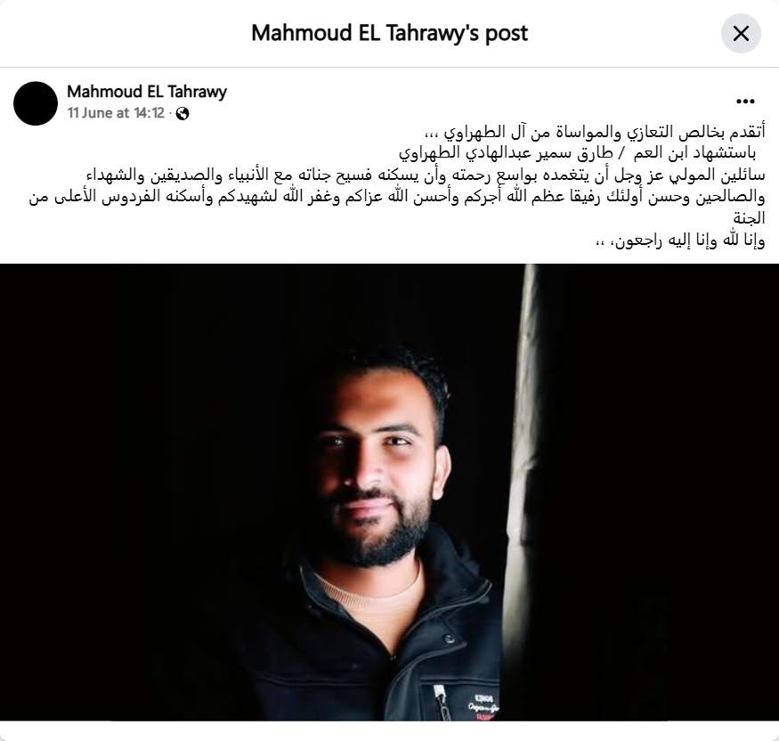 I offer my sincere condolences and sympathy to the Al-Tahrawi family, on the martyrdom of my cousin / Tariq Samir Abdel Hadi Al-Tahrawi, asking God Almighty to have mercy on him and to make him dwell in his spacious gardens with the prophets, the truthful, the martyrs and the righteous, and what good companions they are. May God reward you greatly and may God improve your consolation and may God forgive your martyr and make him dwell in the highest paradise. To God we belong and to Him we shall return.