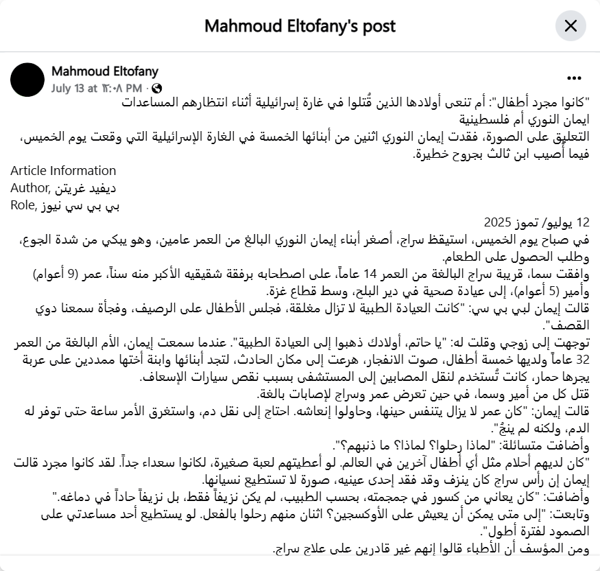 توجهت إلى زوجي وقلت له: "يا حاتم، أولادك ذهبوا إلى العيادة الطبية". عندما سمعت إيمان، الأم البالغة من العمر 32 عاماً ولديها خمسة أطفال، صوت الانفجار، هرعت إلى مكان الحادث، لتجد أبنائها وابنة أختها ممددين على عربة يجرها حمار، كانت تُستخدم لنقل المصابين إلى المستشفى بسبب نقص سيارات الإسعاف.