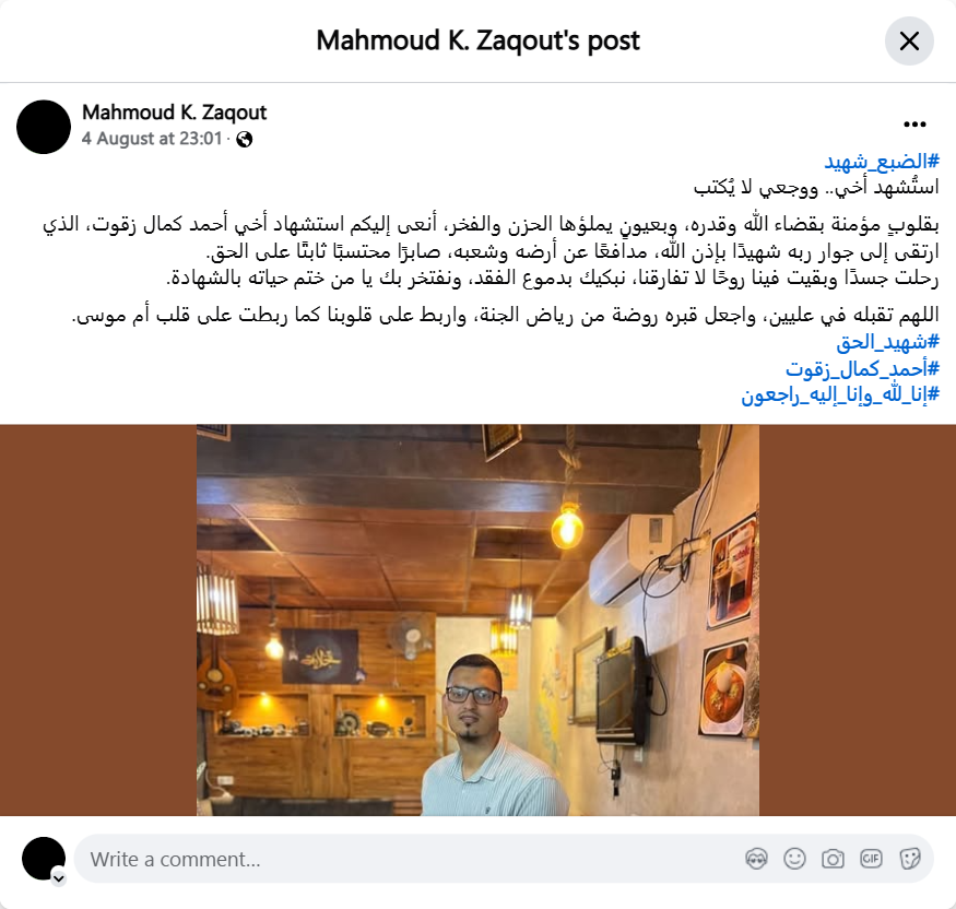 With hearts that believe in God's will and destiny, and with eyes filled with sadness and pride, I announce to you the martyrdom of my brother Ahmed Kamal Zaqout, who ascended to his Lord as a martyr, God willing, defending his land and his people, patient, content, and steadfast in the truth.