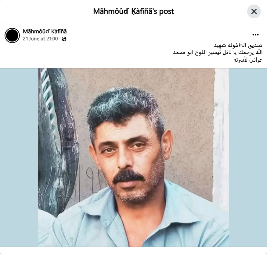 Childhood friend, martyr. May God have mercy on you, Nael Tayseer Al-Louh Abu Muhammad. My condolences to his family.