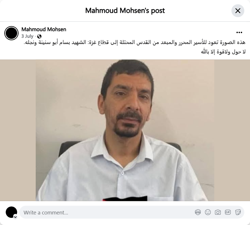 This photo shows the released prisoner deported from occupied Jerusalem to the Gaza Strip: martyr Bassam Abu Sneineh and his son.