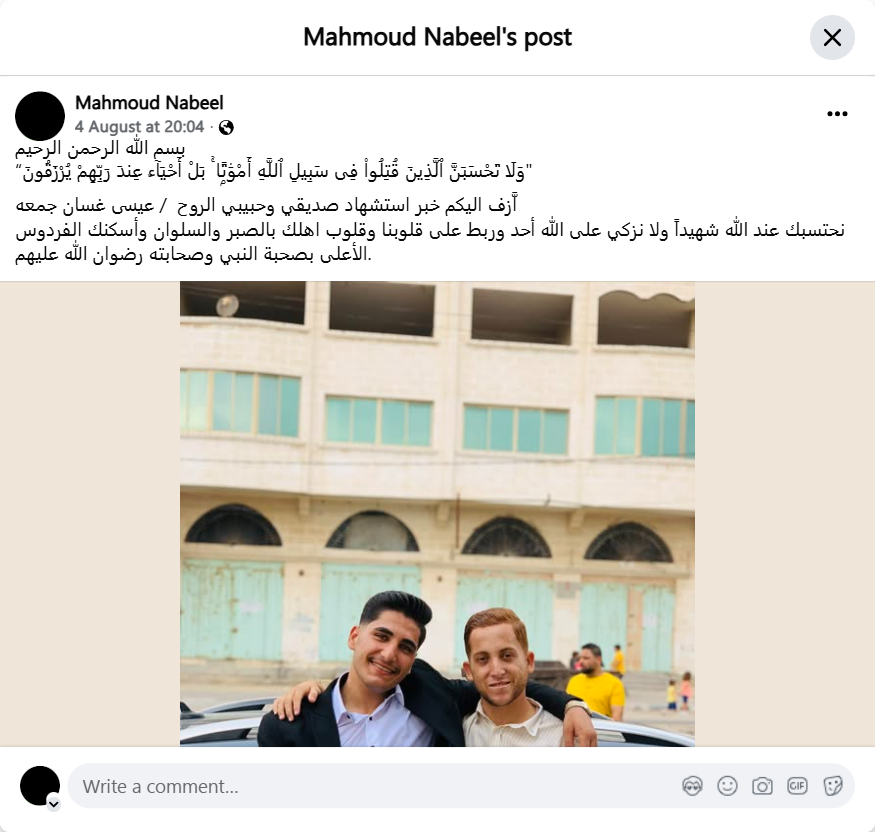 I bring you the news of the martyrdom of my friend and beloved soul / Issa Ghassan Juma.