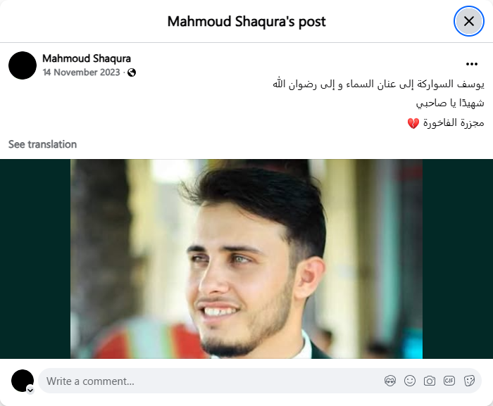 Yousef Al-Sawarka, to the heavens and to the pleasure of God, as a martyr, my friend of the Al-Fakhoura massacre
