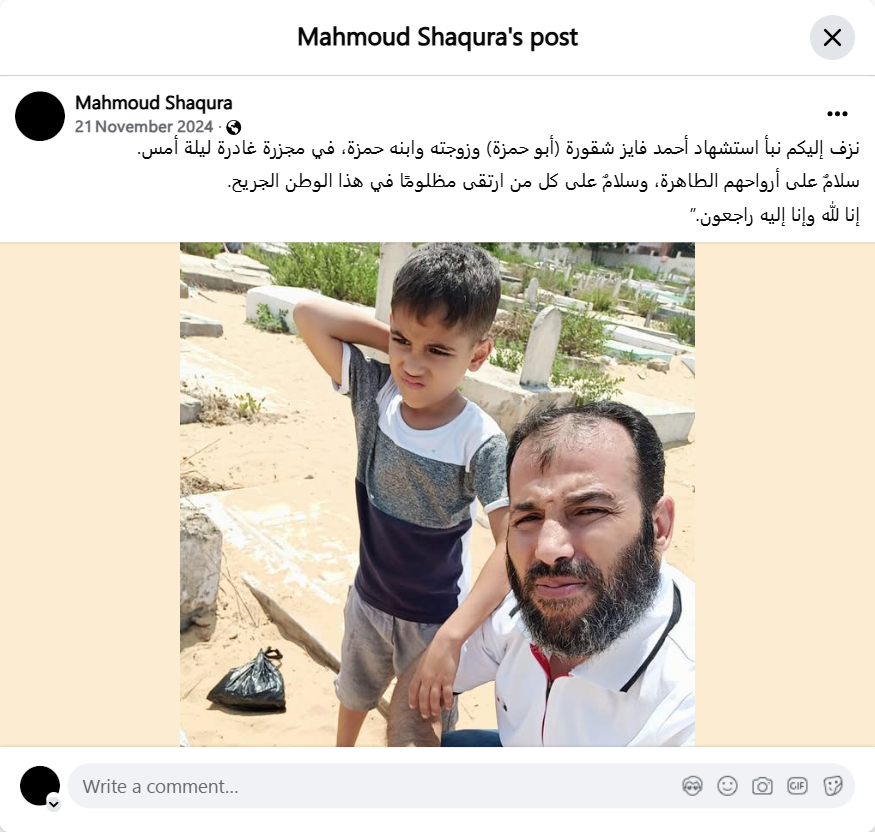 نزف إليكم نبأ استشهاد أحمد فايز شقورة (أبو حمزة) وزوجته وابنه حمزة، في مجزرة غادرة ليلة أمس.سلامٌ على أرواحهم الطاهرة، وسلامٌ على كل من ارتقى مظلومًا في هذا الوطن الجريح.إنا لله وإنا إليه راجعون.”