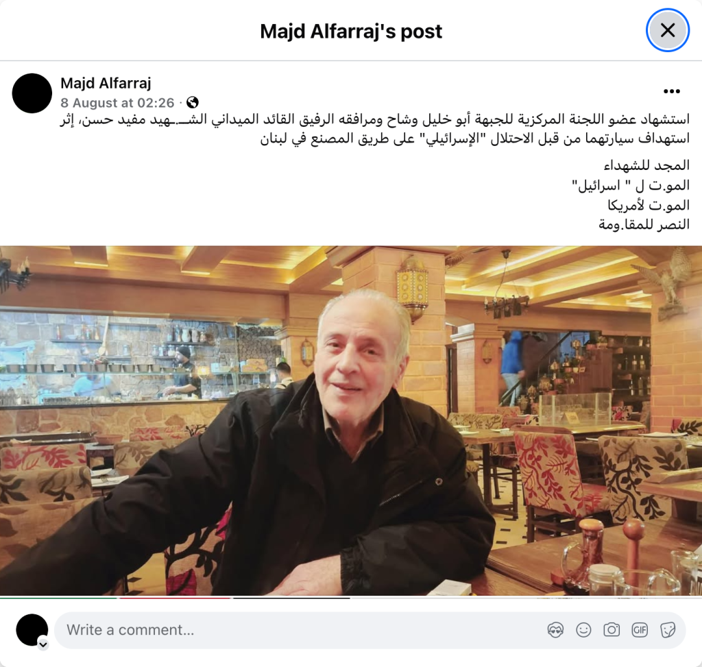 استشهاد عضو اللجنة المركزية للجبهة أبو خليل وشاح ومرافقه الرفيق القائد الميداني الشــ.ـهيد مفيد حسن، إثر استهداف سيارتهما من قبل الاحتلال "الإسرائيلي" على طريق المصنع في لبنان