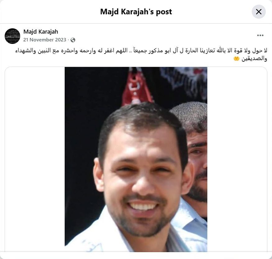 There is no power nor strength except with God. Our deepest condolences to the entire Abu Madhkour family. May God forgive him, have mercy on him, and gather him with the prophets, martyrs, and righteous. Raed Abu Madhkour, from the caravan of martyrs, you have broken my heart, Abu al-Hassan. May God grant patience to your family.