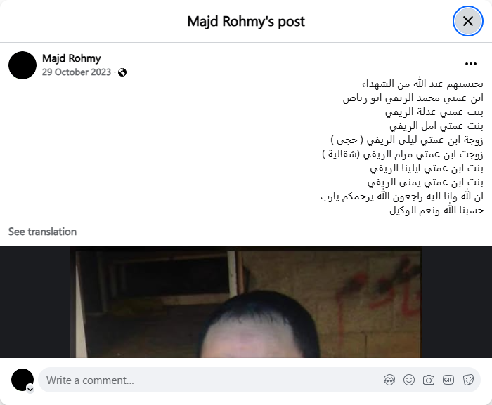 We consider them martyrs with God. My cousin Muhammad Al-Rifi Abu Riyad, my cousin Adla Al-Rifi’s daughter, my cousin Amal Al-Rifi’s wife, my cousin Laila Al-Rifi (Hajji), my cousin Maram Al-Rifi’s wife (Shaqaliya), my cousin Elena Al-Rifi’s daughter, my cousin Yumna Al-Rifi. To God we belong and to Him we shall return. May God have mercy on you, O Lord. God is sufficient for us, and He is the best Disposer of affairs.