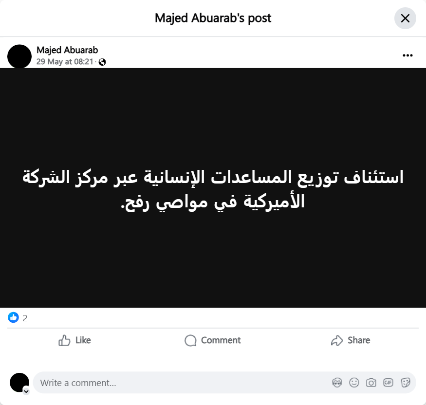 Resuming the distribution of humanitarian aid through the American company's center in Mawasi Rafah.
