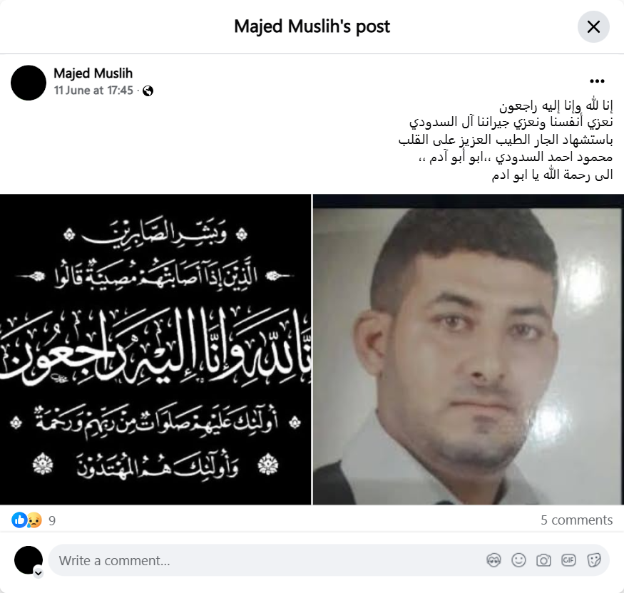 We belong to Allah and to Him we shall return. We offer our condolences to ourselves and to our neighbors, the Al-Sadoudi family, on the martyrdom of our dear and kind neighbor, Mahmoud Ahmed Al-Sadoudi, Abu Abu Adam. May God have mercy on you, Abu Adam.