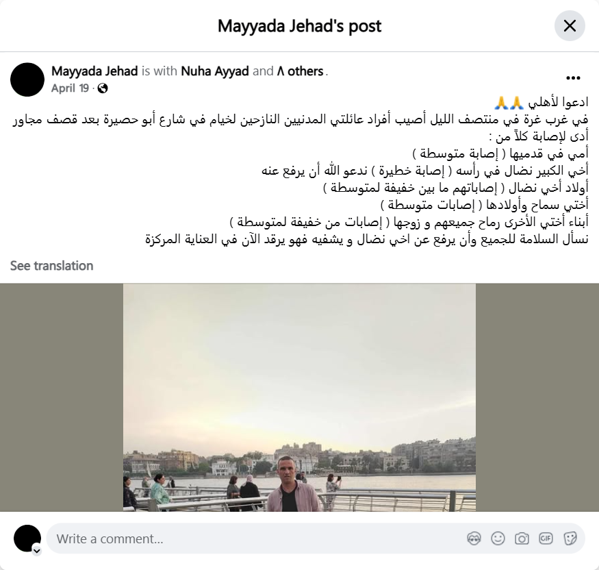 In the west of Gaza City, at midnight, members of my civilian family, who were displaced to tents in Abu Hasira Street, were injured after a nearby bombing that resulted in injuries to each of them: My mother in her feet (moderate injury), my older brother Nidal in his head (serious injury), we ask God to relieve him, my brother Nidal’s children (their injuries range from minor to moderate), my sister Samah and her children (moderate injuries), my other sister Ramah’s children, all of them, and her husband (minor to moderate injuries). We ask God to keep everyone safe and to relieve my brother Nidal and heal him, as he is now lying in intensive care.