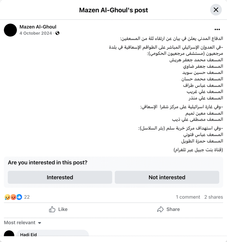 الدفاع المدني يعلن في بيان عن ارتقاء ثلة من المسعفين:-في العدو|ن الإسرائيلي المباشر على الطواقم الإسعافية في بلدة مرجعيون (مستشفى مرجعيون الحكومي):المسعف محمد جعفر هريشالمسعف جعفر ضاويالمسعف حسين سويدالمسعف محمد حسانالمسعف عباس طرافالمسعف علي غريب المسعف علي منذر-وفي غارة اسرائيلية على مركز شقرا الإسعافي:المسعف معين تميمالمسعف مصطفى علي ذيب-وفي استهداف مركز خربة سلم (بئر السلاسل):المسعف عباس فتونيالمسعف حمزة الطويل(قناة بنت جبيل عبر تلغرام)