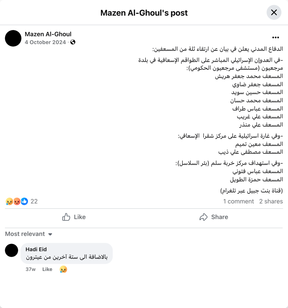 الدفاع المدني يعلن في بيان عن ارتقاء ثلة من المسعفين:-في العدو|ن الإسرائيلي المباشر على الطواقم الإسعافية في بلدة مرجعيون (مستشفى مرجعيون الحكومي):المسعف محمد جعفر هريشالمسعف جعفر ضاويالمسعف حسين سويدالمسعف محمد حسانالمسعف عباس طرافالمسعف علي غريب المسعف علي منذر-وفي غارة اسرائيلية على مركز شقرا الإسعافي:المسعف معين تميمالمسعف مصطفى علي ذيب-وفي استهداف مركز خربة سلم (بئر السلاسل):المسعف عباس فتونيالمسعف حمزة الطويل(قناة بنت جبيل عبر تلغرام)