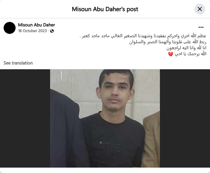 May Allah reward you and me greatly for the loss of our dear little martyr, Majid Majid Kabar. May Allah comfort our hearts and inspire us with patience and solace. To Allah we belong and to Him we shall return. May Allah have mercy on you, my brother.
