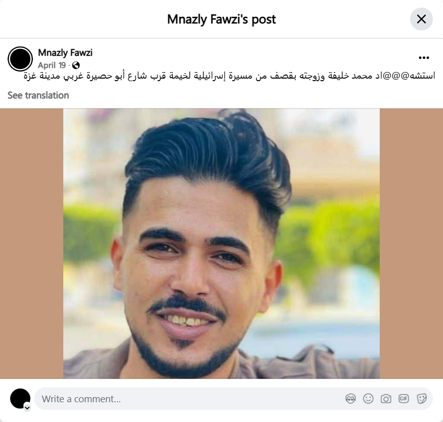 Mohammed Khalifa and his wife were killed in an Israeli drone strike on a tent near Abu Hasira Street, west of Gaza City.
