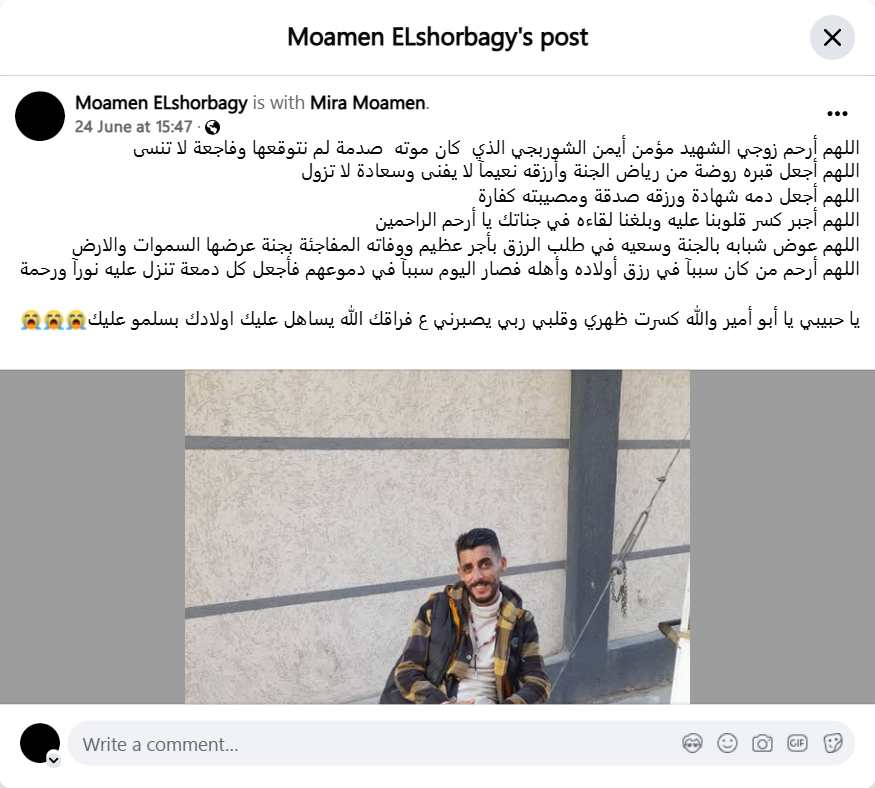 O Allah, have mercy on my martyr husband, Moamen Ayman El-Shorbagy, whose death was a shock we did not expect and an unforgettable tragedy. O Allah, make his grave a garden from the gardens of Paradise and grant him eternal bliss and everlasting happiness. O Allah, make his blood a martyrdom, his livelihood a charity, and his affliction an expiation. O Allah, mend our broken hearts and let us meet him in Your Paradise, O Most Merciful of the merciful. O Allah, compensate his youth with Paradise and his striving to seek a livelihood with a great reward, and his sudden death with a Paradise as wide as the heavens and the earth. O Allah, have mercy on those who were a reason for the livelihood of their children and family and today became a reason for their tears, so make every tear that falls for him a light and mercy. O my beloved Abu Amir, by Allah, you broke my back and my heart. May God give me patience for your separation. May God make it easy for you. Your children send their regards to you.