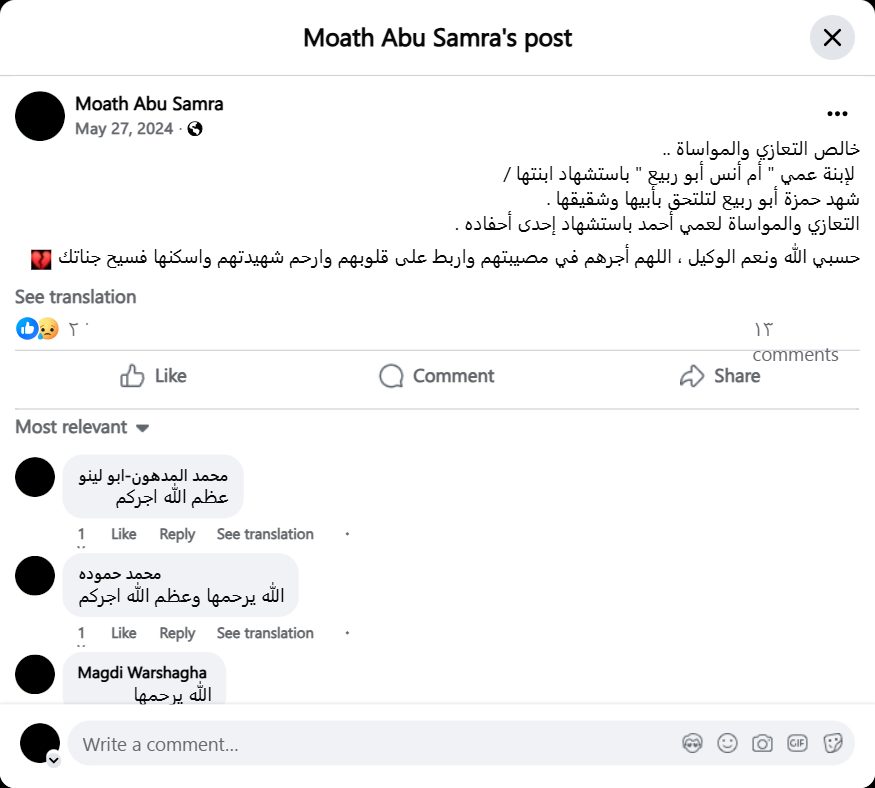 Condolences and sympathy to my uncle Ahmed on the martyrdom of one of his grandchildren.