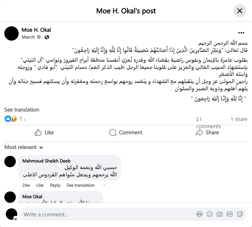 With hearts filled with faith and souls content with God's will and destiny, we offer our condolences to the Turquoise Towers area and the Al-Titi family on the martyrdom of our beloved and dear friend, the man of good memory, Uncle Hussam Al-Titi "Abu Fadi," his wife, and his youngest daughter.