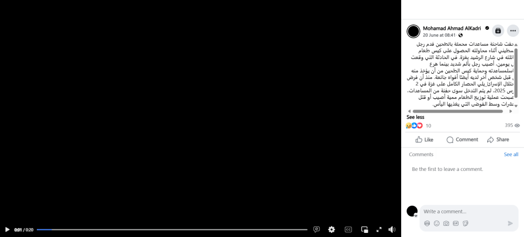 سحقت شاحنة مساعدات محملة بالطحين قدم رجل فلسطيني أثناء محاولته الحصول على كيس طعام لعائلته في شارع الرشيد بغزة. في الحادثة التي وقعت قبل يومين، أصيب رجل بألم شديد بينما هرع الناسلمساعدته وحماية كيس الطحين من أن يؤخذ منه من قبل شخص آخر لديه أيضًا أفواه جائعة. منذ أن فرض الاحتلال الإسرائ_يلي الحصار الكامل على غزة في 2 مارس 2025، لم يتم التدخل سوى حفنة من المساعدات، وأصبحت عملية توزيع الطعام ممية أصيب أو قتل العشرات وسط الفوضى التي يغذيها اليأس.