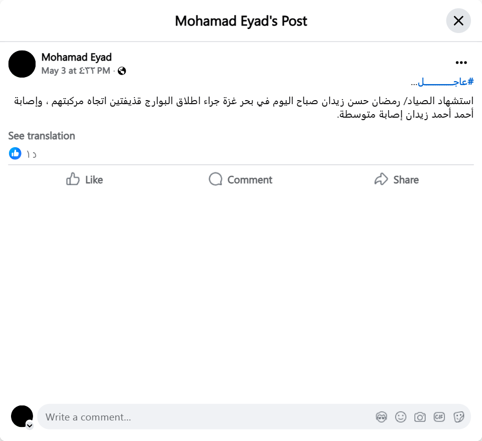 Fisherman Ramadan Hassan Zidane was martyred this morning in the Gaza Sea after two shells were fired at his boat by Israeli warships. Ahmed Ahmed Zidane sustained moderate injuries.