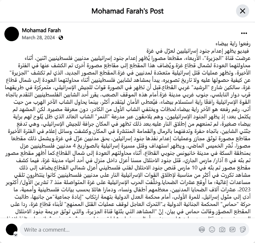 They raised a white flag. A video shows Israeli soldiers executing two unarmed civilians in Gaza. Al Jazeera broadcast a video clip on Wednesday showing Israeli soldiers executing two Palestinian civilians as they tried to return to the northern Gaza Strip. This clip is added to other videos that have been revealed recently, showing deliberate Israeli killings of civilians in Gaza. The new video, which Al Jazeera did not reveal how it obtained it or when it was filmed, begins with scenes of two Palestinian youths trying to return to the northern Gaza Strip, taking Al-Rashid Street in the western part of the Strip. Before the picture appears, Israeli army forces positioned in their path near Al-Nabulsi Roundabout, southwest of Gaza City. Faced with this difficult situation, one of the two Palestinian youths decides to advance towards the Israeli force, raising a white flag of surrender. He is given permission to advance further, while the other youth tries to flee from wherever he came, despite also raising a white flag. Moments later, the first youth disappears from the frame, and his fate is unknown. But the scene is not yet complete; Israeli soldiers are seen chasing the returning young man in a Tiger armored vehicle, who kept waving a small white flag at them, which did not prevent them from shooting him. An Israeli army bulldozer is then seen pushing the bodies of the two young men into a hole and burying them in the sand and garbage scattered around. Media outlets have recently revealed video clips documenting massacres and executions carried out by Israeli soldiers against unarmed civilians in Gaza. This includes a video clip, published last Thursday, showing an Israeli drone targeting and killing four unarmed Palestinian civilians with missiles in the Al-Sikka area of Khan Yunis, south of the Gaza Strip, as they were trying to return to the northern part of the Strip. A video clip broadcast on March 8th showed Israeli soldiers killing an unarmed elderly man inside a house in a neighborhood in Gaza City, while a video clip broadcast on March 10th showed Israeli soldiers sniping at an unarmed Palestinian boy in the northern part of the Gaza Strip. In addition, scenes have been repeated on more than one occasion of Israeli forces shooting at Palestinian civilians waiting to receive relief aid. The Israeli war on Gaza, which has been ongoing since October 7, 2023, has left tens of thousands of civilian victims, most of them children and women, and massive destruction, according to Palestinian and international statements. This has led to Israel appearing, for the first time, before the International Court of Justice on charges of committing "genocide." For its part, Hamas called on the International Criminal Court to "take urgent action to stop the systematic killing" of the people of the Gaza Strip, in response to the video clip. Hamas said in a statement that "the scenes broadcast by Al Jazeera, which document the crime of the Zionist occupation soldiers as they cold-bloodedly killed two unarmed young civilians who were holding white flags, and then bulldozed their bodies with a bulldozer to conceal their heinous crime, are further evidence of the extent of fascism and criminality that governs Zionist behavior." It added that this comes "in the context of the brutal war of extermination against our people in the Gaza Strip, which was discussed yesterday by the UN Special Rapporteur on Human Rights in the Palestinian Territories, Francesca Albanese." In its statement, Hamas called on the United Nations and all international institutions International judicial bodies, especially the International Criminal Court, called for "urgent action to halt the systematic killing of our people and to take the necessary measures to hold this rogue entity and its terrorist war criminal leaders accountable for the crimes they are committing against children and defenseless civilians."
