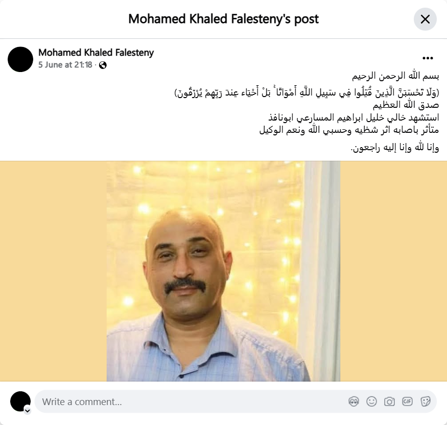 بسم الله الرحمن الرحيم﴿وَلَا تَحْسَبَنَّ الَّذِينَ قُتِلُوا فِي سَبِيلِ اللَّهِ أَمْوَاتًا ۚ بَلْ أَحْيَاءٌ عِندَ رَبِّهِمْ يُرْزَقُونَ﴾صدق الله العظيماستشهد خالي خليل ابراهيم المسارعي ابونافذ متأثر باصابه اثر شظيه وحسبي الله ونعم الوكيل وإنا لله وإنا إليه راجعون.