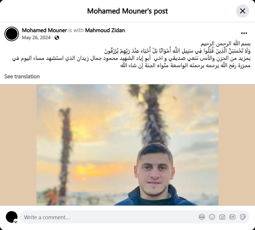 With deep sorrow and grief, we mourn the death of our friend and brother, Abu Iyad, the martyr Mahmoud Jamal Zidan, who was martyred this evening in the Rafah massacre. May God have mercy on him with His vast mercy. May his abode be in Paradise, God willing.