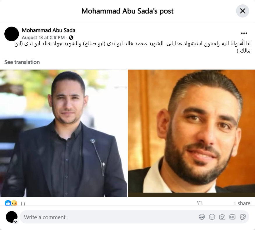 We belong to God and to Him we shall return. The martyrdom of my two sons, martyr Muhammad Khaled Abu Nada (Abu Saleh) and martyr Jihad Khaled Abu Nada (Abu Malik).