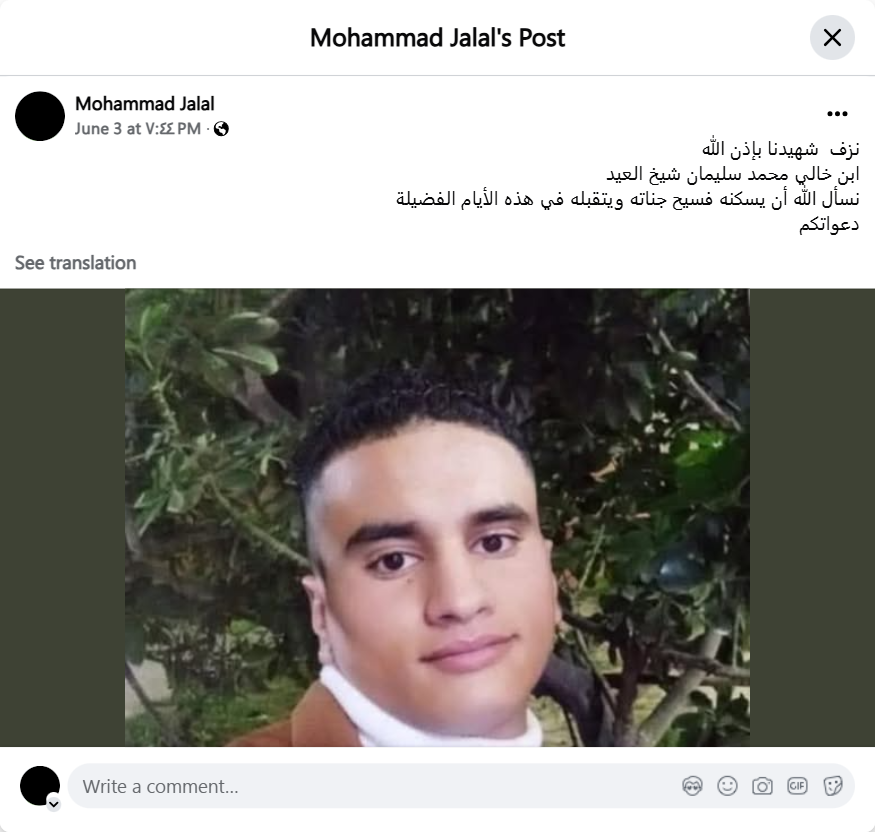 We mourn our martyr, God willing, my cousin Muhammad Suleiman Sheikh Al-Eid. We ask God to grant him a place in His spacious heavens and accept him in these virtuous days. Your prayers.