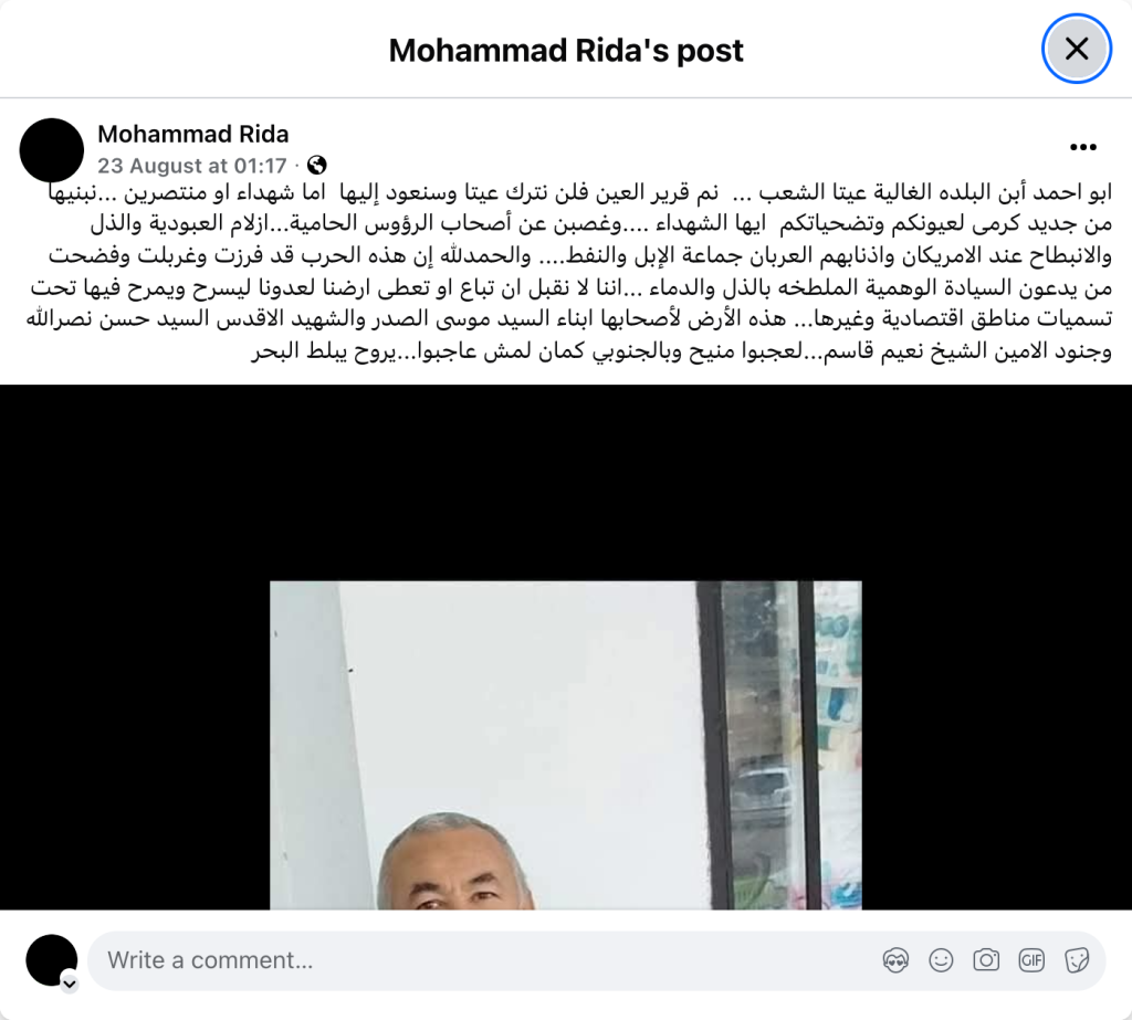 Abu Ahmad, son of the dear town of Aita al-Shaab... sleep in peace, for we will not abandon Aita and we will return to it, either as martyrs or victorious... we will rebuild it for your eyes and sacrifices, O martyrs... and in spite of those with hot heads... the lackeys of slavery, humiliation and prostration to the Americans and their Arab lackeys, the camel and oil group... thank God this war has sorted, sifted and exposed those who claim illusory sovereignty stained with humiliation and blood... we do not accept that our land be sold or given to our enemy to roam freely in under the names of economic zones and others... this land belongs to the owners of the sons of Sayyed Musa al-Sadr and the holy martyr Sayyed Hassan Nasrallah and the soldiers of the faithful Sheikh Naim Qassem... if they like it, that's fine, and in the south too if they don't like it... they can go and pave the sea