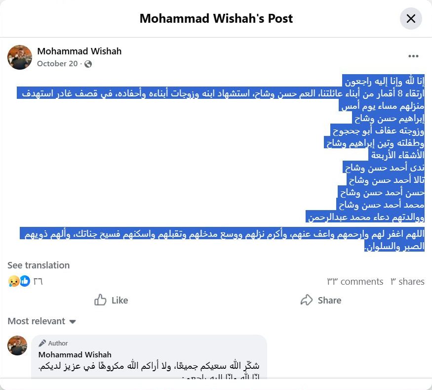 To God we belong and to Him we shall return. Eight members of our family, including Uncle Hassan Washah, his son, his daughters-in-law, and his grandchildren, were martyred in a treacherous bombing that targeted their home last night.