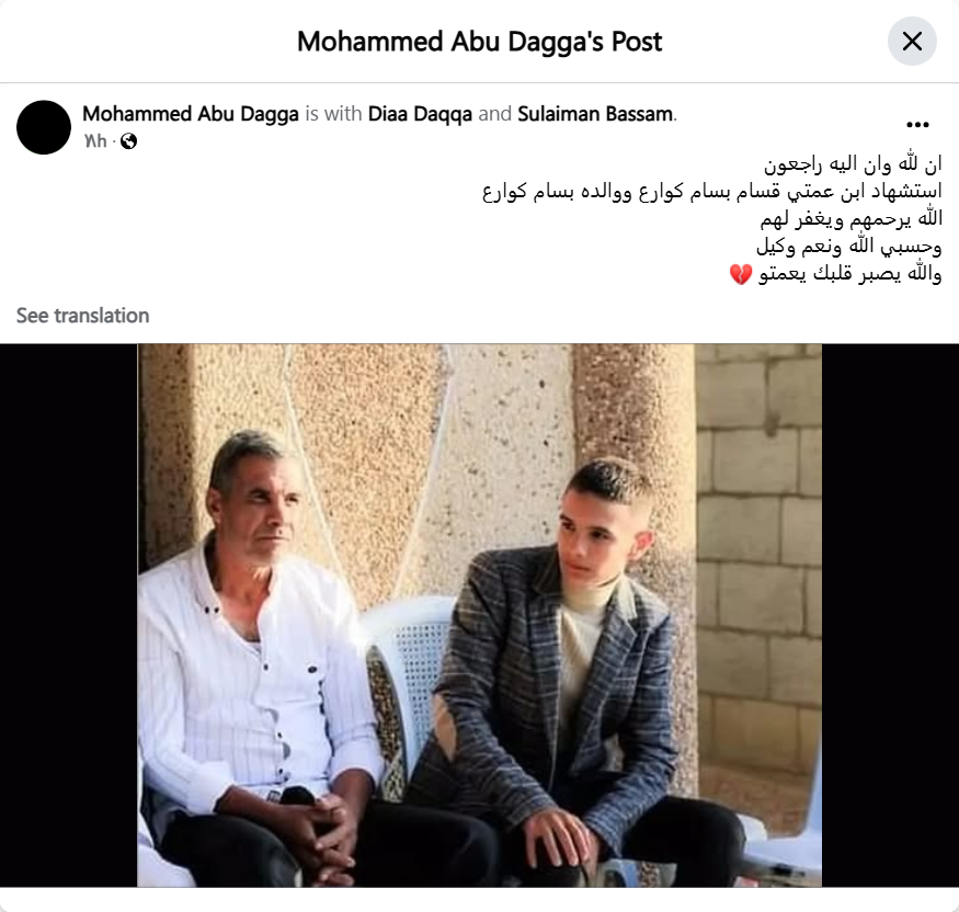 To God we belong and to Him we shall return. My cousin Qassam Bassam Kaware’ and his father Bassam Kaware’ were martyred. May God have mercy on them and forgive them. God is sufficient for me, and He is the best Disposer of affairs. May God give you patience, my uncle.