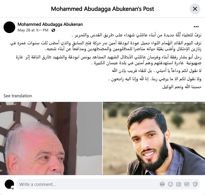 We mourn the passing of a new group of my family members, martyrs on the path to Jerusalem and liberation. Today we mourn the great leader, Major General Jamil Odeh Abu Daqqa, the former Secretary of the Fatah Movement, who spent a third of his life in the occupation’s dungeons and spent the rest of his life supporting the oppressed and persecuted and defending his people. Abu Bashar departed along with the sons and knights of my heroic family, the martyred Mujahid Younis Abu Daqqa and the martyr Tariq al-Naqa, as a result of a treacherous Zionist raid that targeted them while they were safe in the town of Abasan al-Kabira. We do not say farewell to you, my beloved, but until we meet again soon, God willing, and we say to you only what pleases our Lord. To God we belong and to Him we shall return. God is sufficient for us, and He is the best Disposer of affairs.