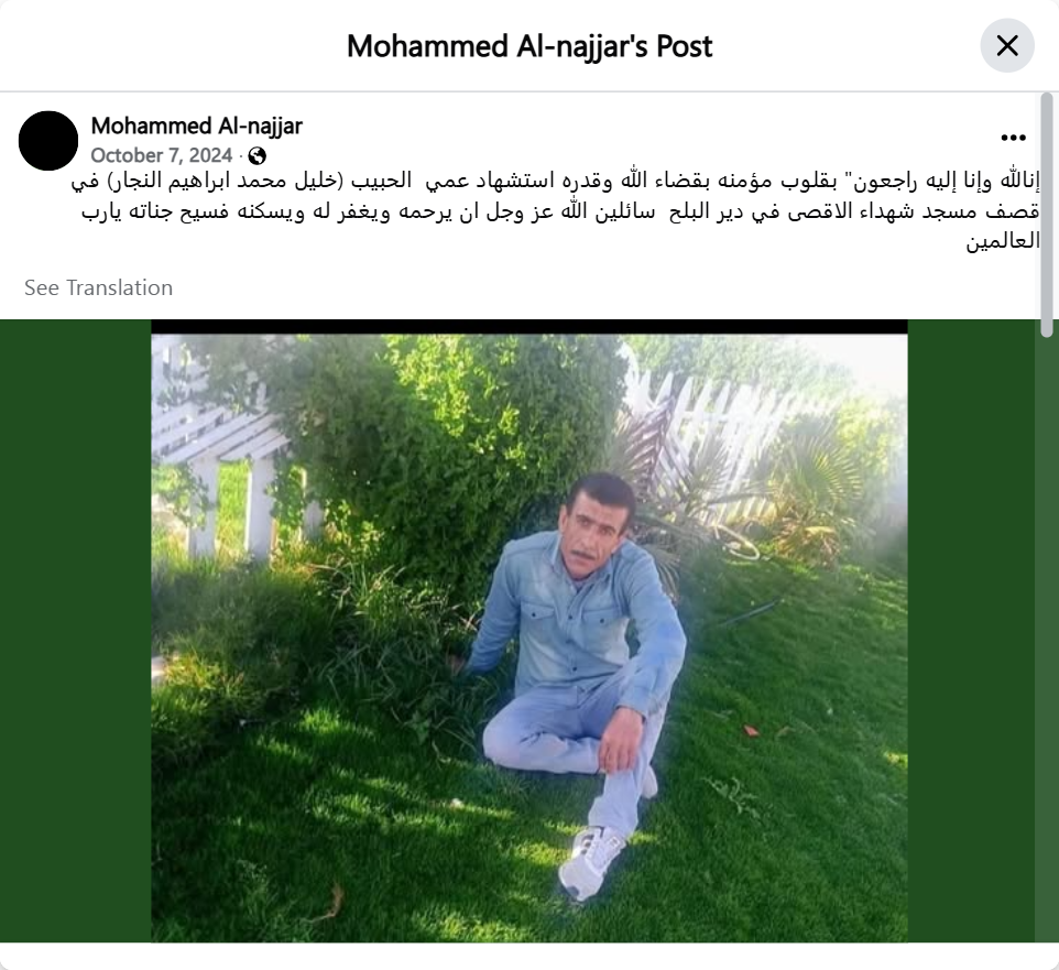 We belong to God and to Him we shall return. With hearts that believe in God’s will and destiny, my beloved uncle (Khalil Muhammad Ibrahim Al-Najjar) was martyred in the bombing of the Al-Aqsa Martyrs Mosque in Deir al-Balah. We ask God Almighty to have mercy on him, forgive him, and grant him a place in His spacious gardens, O Lord of the worlds. See Translation All reactions: 3636