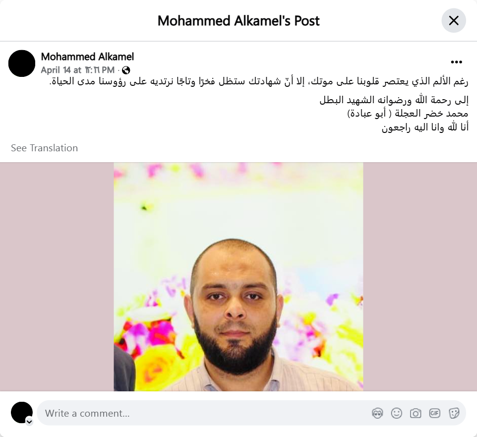 Despite the pain that pierces our hearts over your death, your martyrdom will remain a source of pride and a crown we will wear on our heads for the rest of our lives. To the mercy and pleasure of God, the martyred hero Muhammad Khader Al-Ajla (Abu Ubadah)