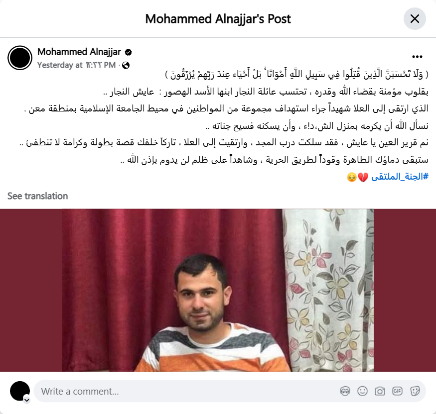 With hearts that believe in God's will and destiny, the Al-Najjar family mourns their son, the fierce lion: Ayesh Al-Najjar, who ascended to heaven as a martyr as a result of targeting a group of citizens in the vicinity of the Islamic University in the Ma'an area.