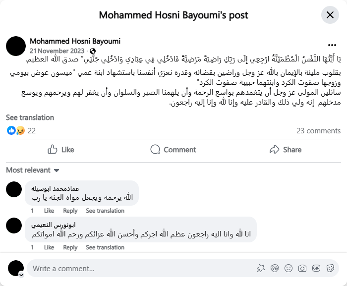 With hearts full of faith in God Almighty and satisfied with His judgment and destiny, we offer our condolences for the martyrdom of my cousin, Maysoun Awad Bayoumi, her husband Safwat El-Kurd, and their daughter, Habeeba Safwat El-Kurd.