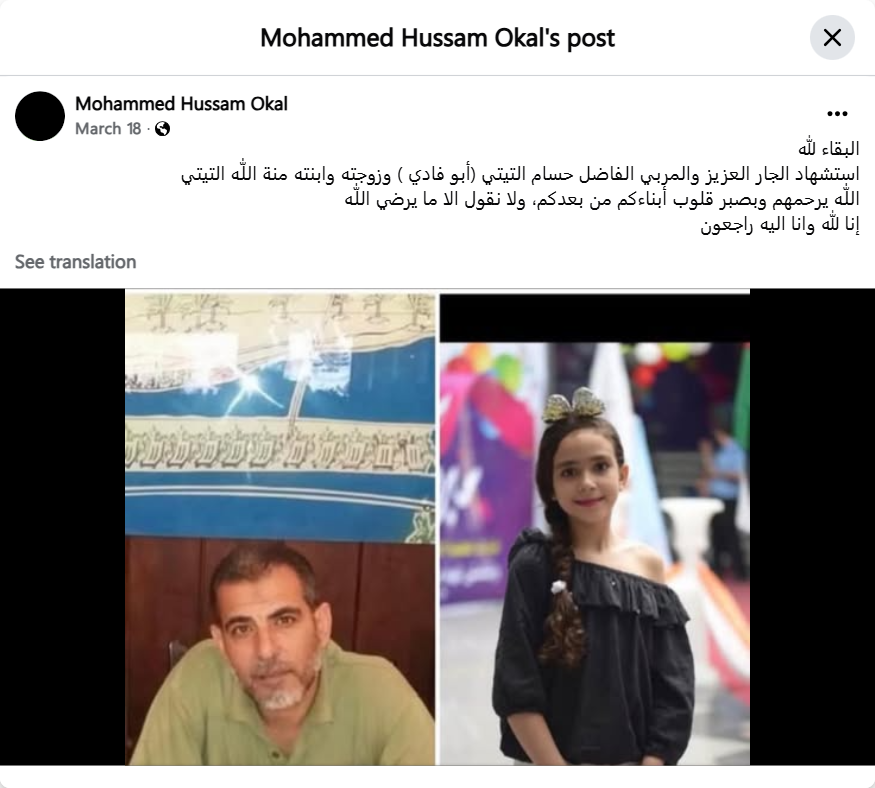 استشهاد الجار العزيز والمربي الفاضل حسام التيتي (أبو فادي ) وزوجته وابنته منة اللّٰه التيتي