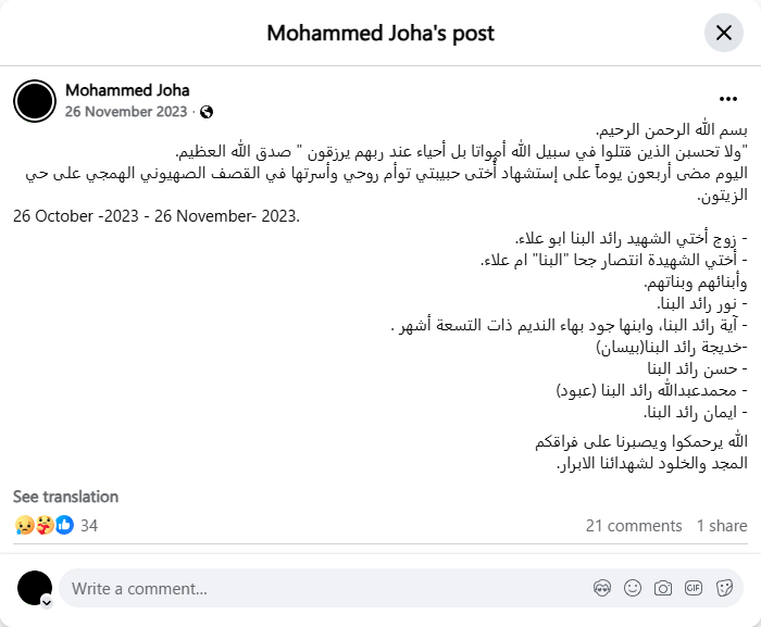 Today marks forty days since the martyrdom of my beloved sister, my soulmate, and her family in the barbaric Zionist bombing of the Zeitoun neighborhood.