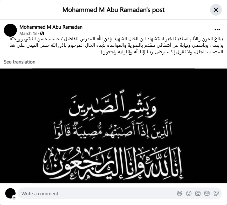 It is with great sadness and pain that we received the news of the martyrdom of our cousin, the martyr, God willing, the honorable teacher / Hussam Hassan Al-Titi, his wife and daughter. On behalf of myself and my brothers, we offer our condolences and sympathy to the sons of the deceased, God willing, Hassan Al-Titi, on this great loss. We say only what pleases our Lord {To God we belong and to Him we shall return}.