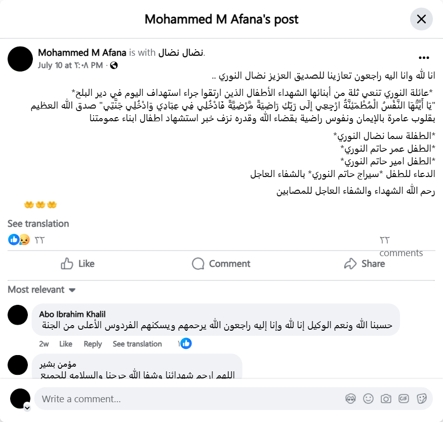 *The Al-Nouri family mourns a group of its martyred children who were killed as a result of today's targeting in Deir al-Balah.*