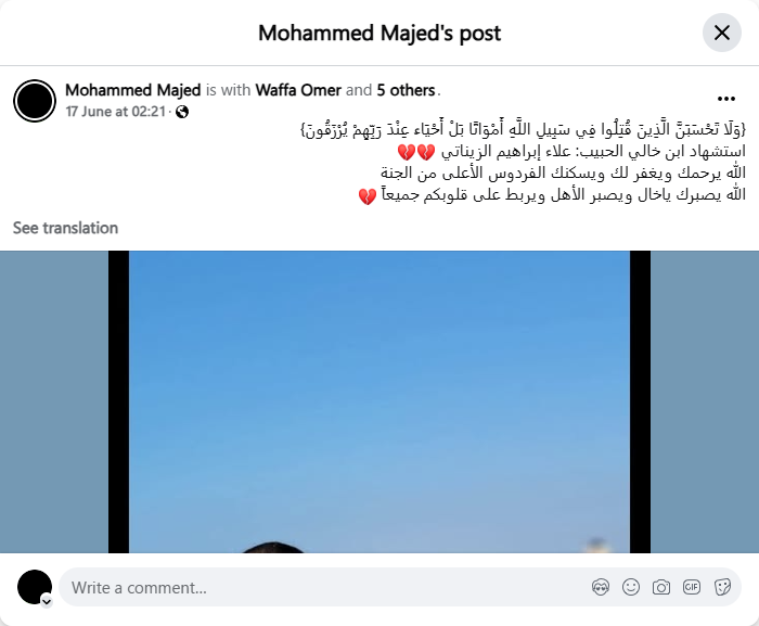 The martyrdom of my beloved cousin: Alaa Ibrahim Al-Zainati. May God have mercy on you, forgive you, and grant you the highest place in Paradise.