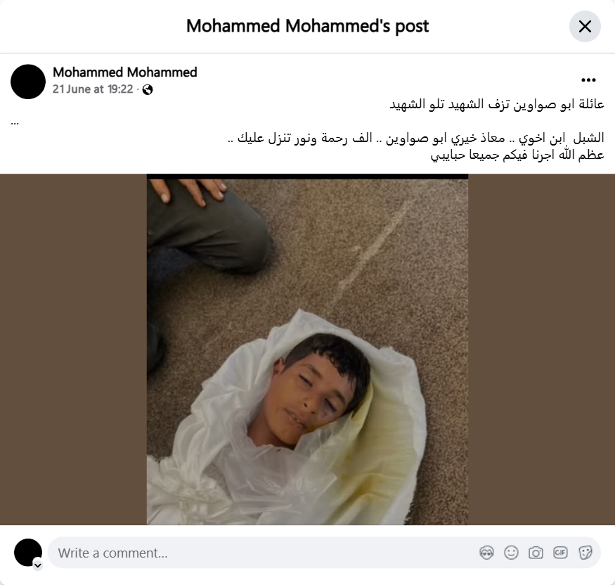 The Abu Sawawin family mourns one martyr after another... the young nephew, Moaz Khairi Abu Sawawin... a thousand mercies and light descend upon you... may God reward us greatly for all of you, my beloved ones.