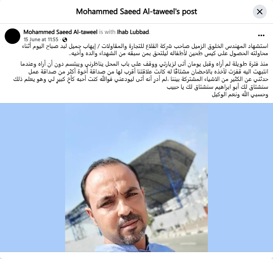 The martyrdom of the honorable engineer, colleague, owner of Al Qalaa Trading and Contracting Company / Ihab Jamil Labad this morning while trying to get a bag of flour for his children to join the martyrs who preceded him, his father and brother.. It has been a long time since I saw him. Two days ago, he came to visit me and stood at the door of the shop looking at me and smiling without me seeing him. When I noticed him, I jumped to hug him, missing him. Our relationship was closer to a brotherly friendship than a work friendship. He told me about many things we had in common. I did not know that he came to say goodbye to me. By God, I loved him like an older brother, and he knows that. We will miss you, Abu Ibrahim. We will miss you, my beloved. God is sufficient for us, and He is the best Disposer of affairs.