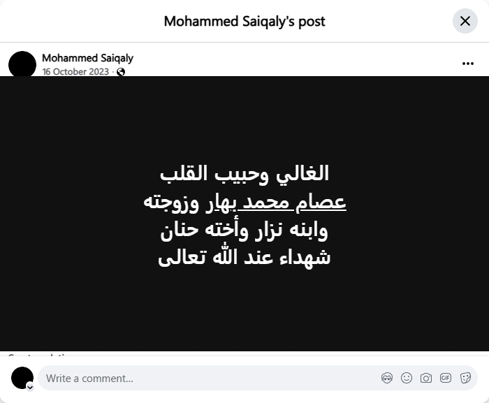 Dear and beloved, Issam Muhammad Bahar, his wife, his son Nizar, and his sister Hanan, are martyrs in the sight of God Almighty.