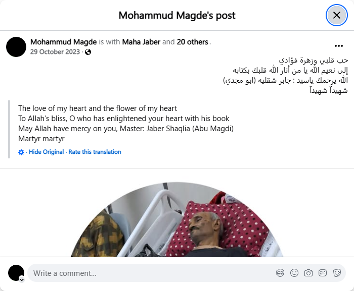 حب قلبي وزهرة فؤادي إلى نعيم الله يا من أنار الله قلبك بكتابهالله يرحمك ياسيد : جابر شقليه (ابو مجدي)شهيدآ شهيدآ The love of my heart and the flower of my heartTo Allah's bliss, O who has enlightened your heart with his bookMay Allah have mercy on you, Master: Jaber Shaqlia (Abu Magdi)Martyr martyr · Hide Original · Rate this translation