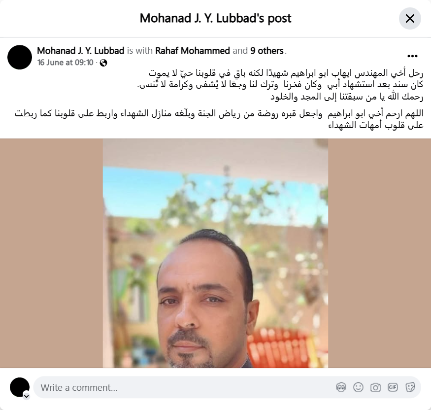 My brother, Engineer Ihab Abu Ibrahim, has passed away as a martyr, but he remains alive in our hearts, he will never die. He was a support after the martyrdom of my father, he was our pride and he left us with an incurable pain and an unforgettable dignity. May God have mercy on you, you who preceded us to glory and immortality. O God, have mercy on my brother Abu Ibrahim and make his grave a garden from the gardens of Paradise and grant him the dwellings of the martyrs and bind our hearts as you bound the hearts of the mothers of the martyrs