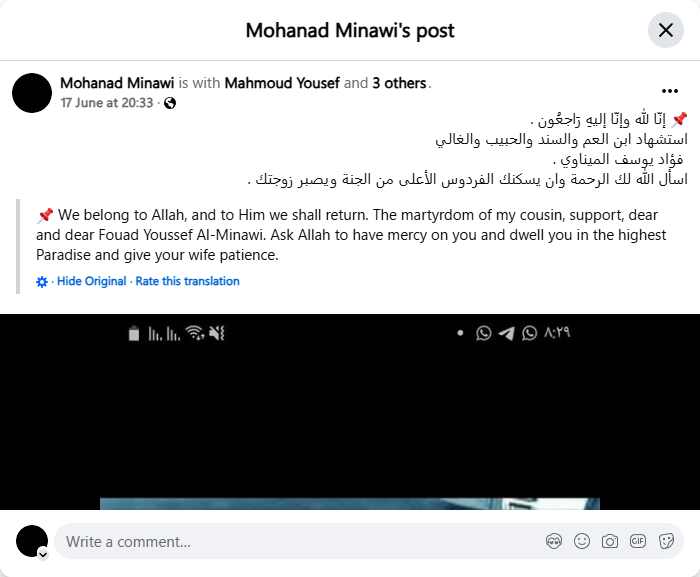 To Allah we belong and to Him we shall return. The martyrdom of our cousin, support, beloved and dear Fouad Yousef Al-Minawi. I ask Allah to have mercy on you and to grant you the highest level of Paradise and to give your wife patience.
